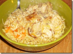 How often do you think about portion sizes? Most experts say, for proteins, a portion is about the size of a deck of cards or the palm of your hand. If you go by that measurement, then most chicken breasts are two portions. But, cut one in half and it doesn’t look like much. If you boil it and then shred the chicken, it looks like a much bigger serving. I know it’s just a trick of the eye, but it stretches the budget. I recently purchased a package of three boneless, skinless chicken breasts. I boiled them with garlic, pepper and a little salt. I shredded the chicken and used half of it the first night in a huge portion of stir-fry with rice and vegetables. I used the other half in this casserole. So, three chicken breasts that would have been three servings if cooked alone, became dinner for four people over two nights. How do you stretch your food dollar?